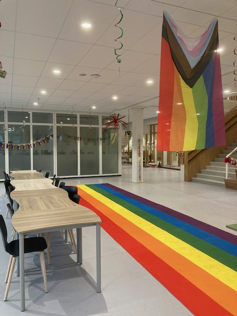 Ik voel me er meteen zeer welkom. De regenboogvlaggetjes hangen uit, er hangen “Progress pride vlaggen” en de regenboogloper is uitgerold.