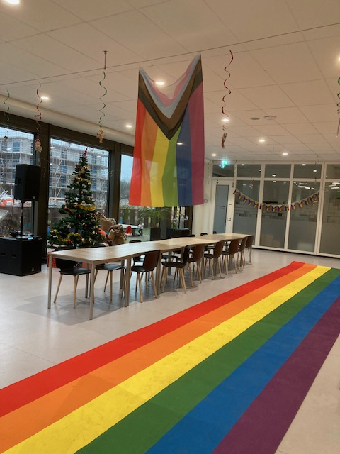 Ik voel me er meteen zeer welkom. De regenboogvlaggetjes hangen uit, er hangen “Progress pride vlaggen” en de regenboogloper is uitgerold.